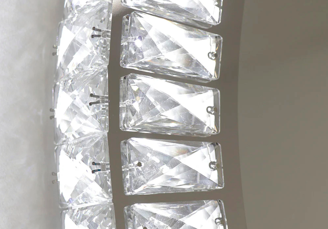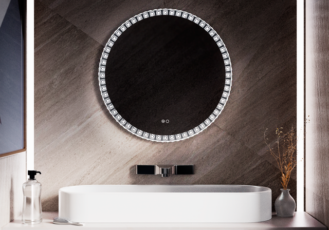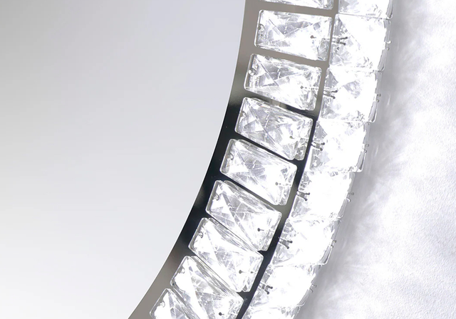 ESPELHO CIRCULAR COM MOLDURA DE BRILHANTES EM FORMA DE DIAMANTES