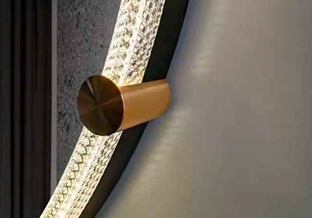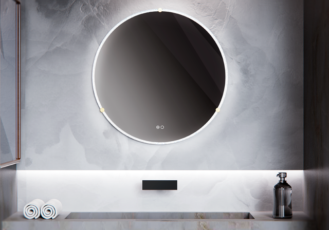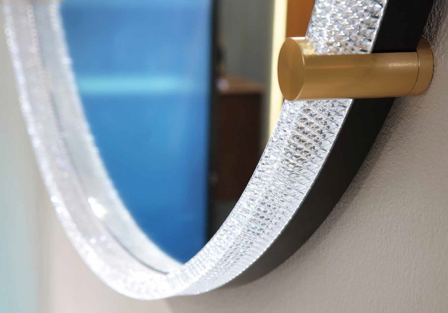 ESPELHO CIRCULAR COM ARO FRONTAL QUE CRIA UM ELEGANTE EFEITO CRISTAL, ADORNADO COM 3 DETALHES DOURADOS.