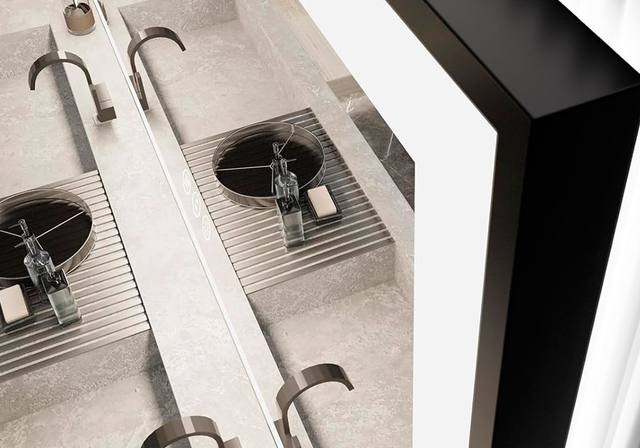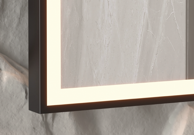 ESPELHO RETANGULAR DE ALTA QUALIDADE COM FOSCAGEM FRONTAL A TODA A VOLTA E MOLDURA EM ALUMÍNIO COM ACABAMENTO PRETO MATE.